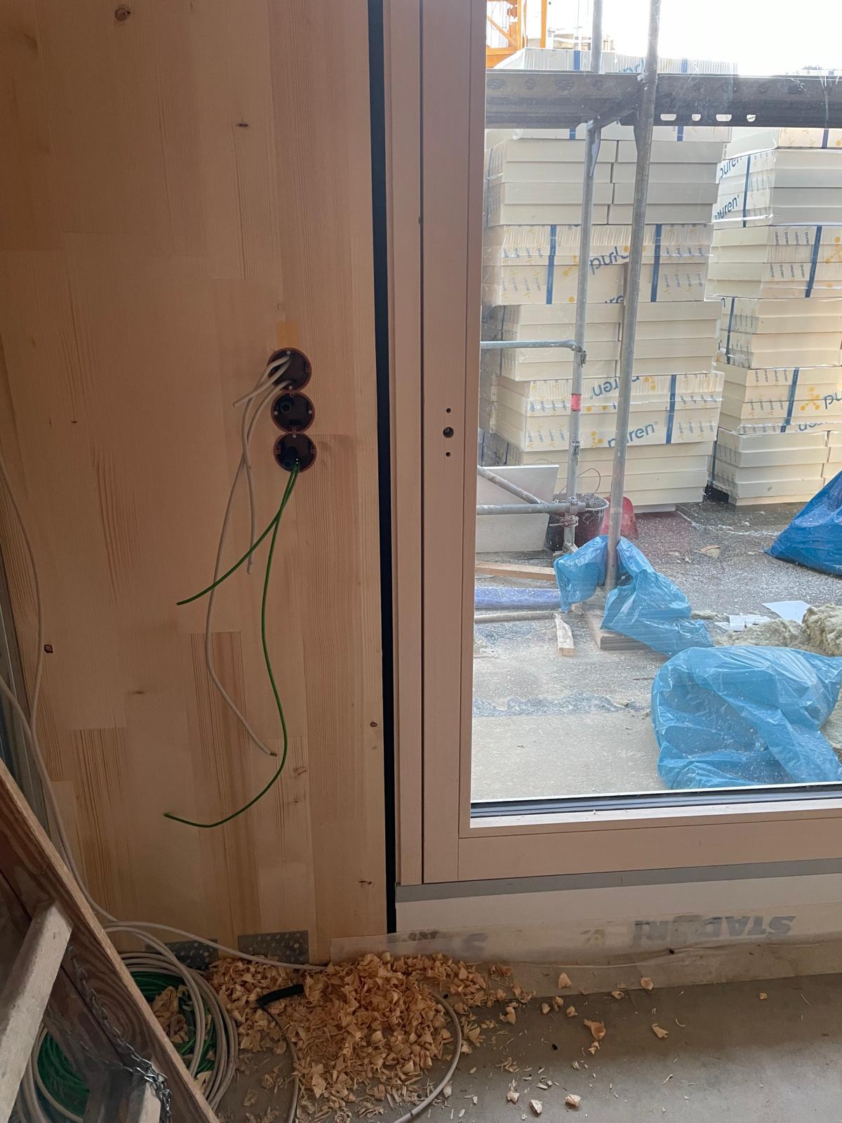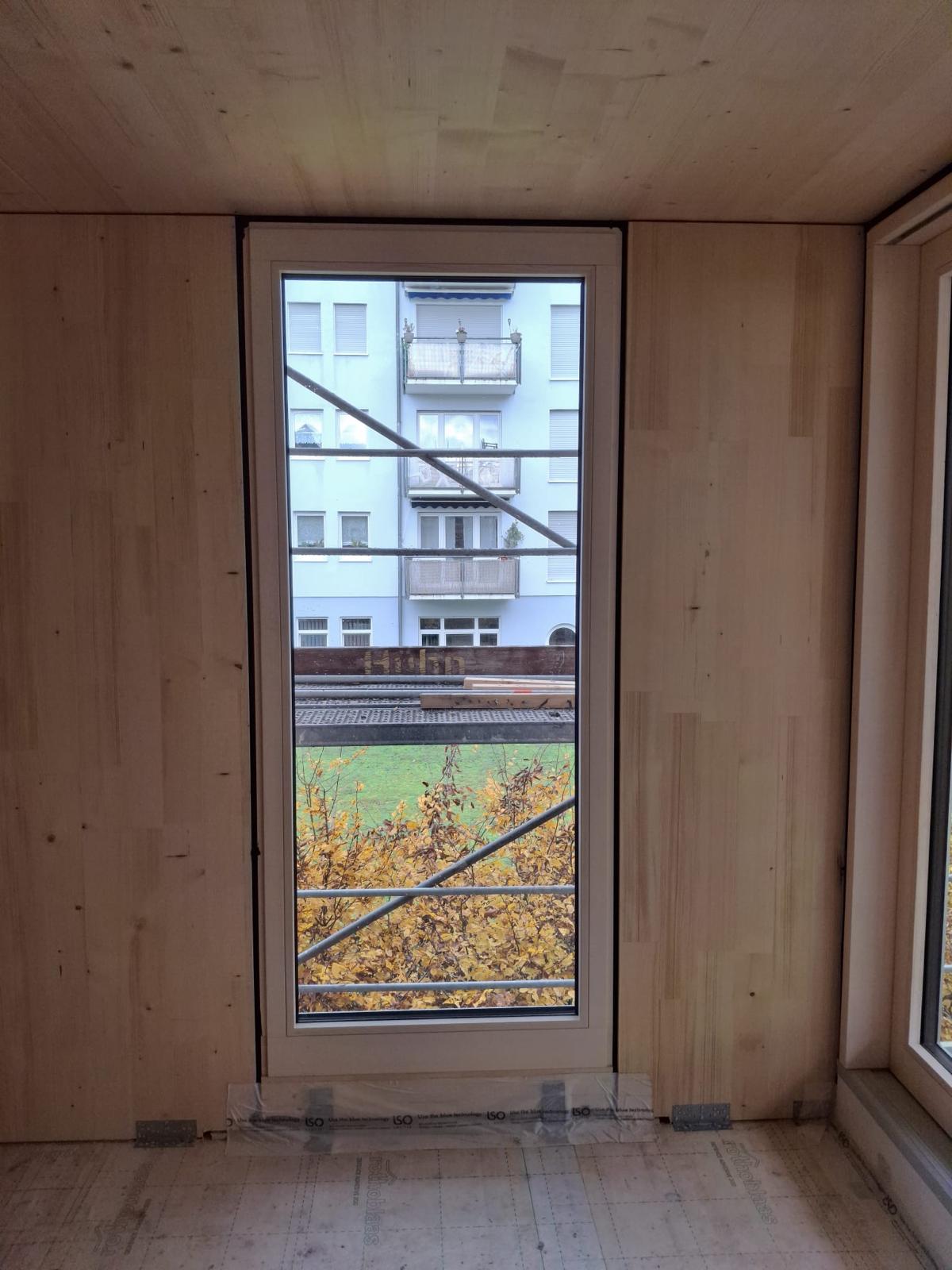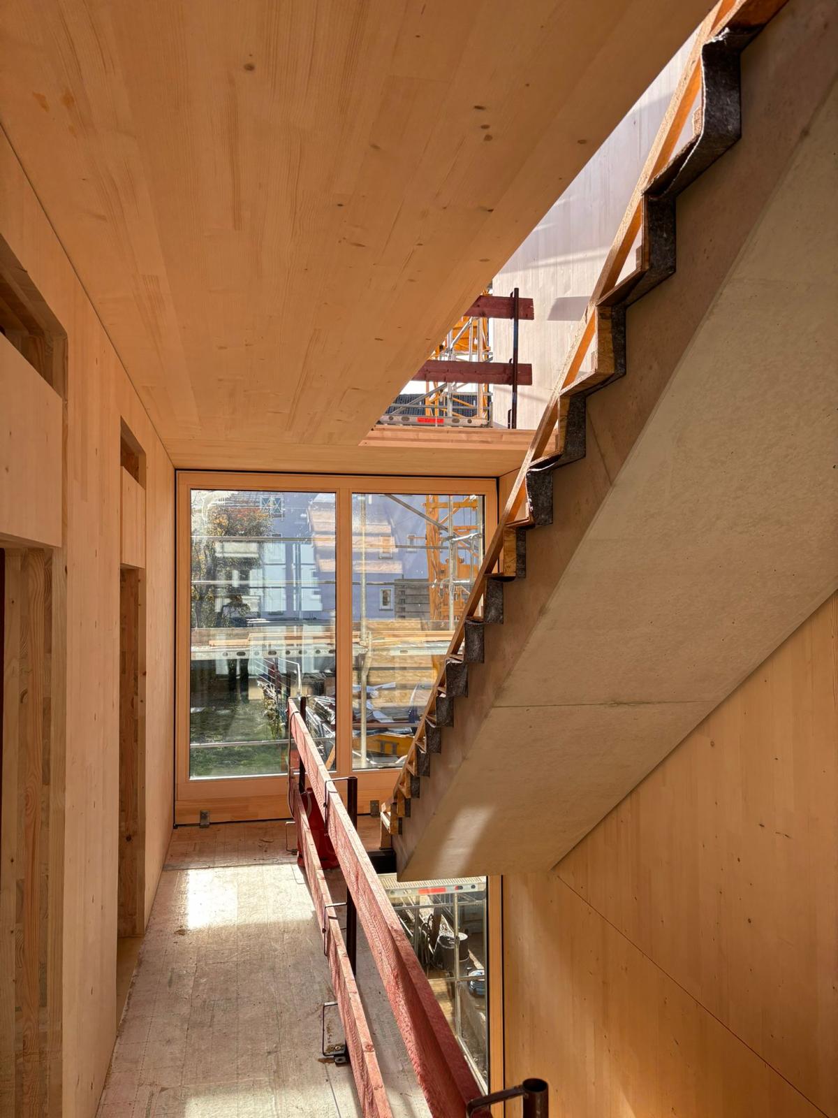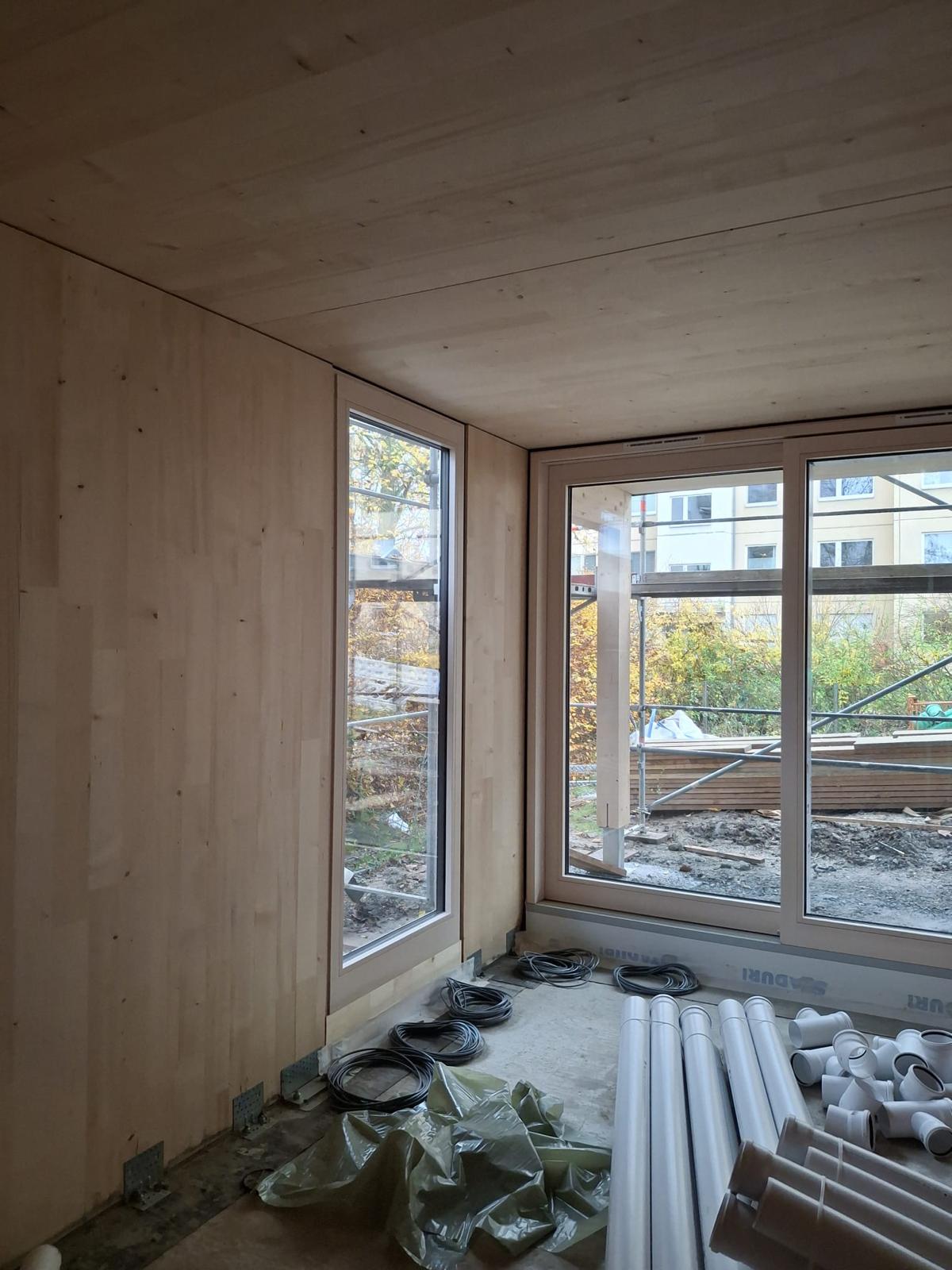 Der Großteil der Innenräume des Gebäudes sind sichtbare CLT-Holzwände. Die Wand ist fertig wenn der Zimmermann sie aufbaut und kann sichtbar bleiben. Dabei wird die Wand bereits im Werk gehobelt und geschliffen und fertig angeliefert. ELT und TGA werden in der Werksplanung und bei der Fertigung im Werk berücksichtigt und in der Wand versteckt.