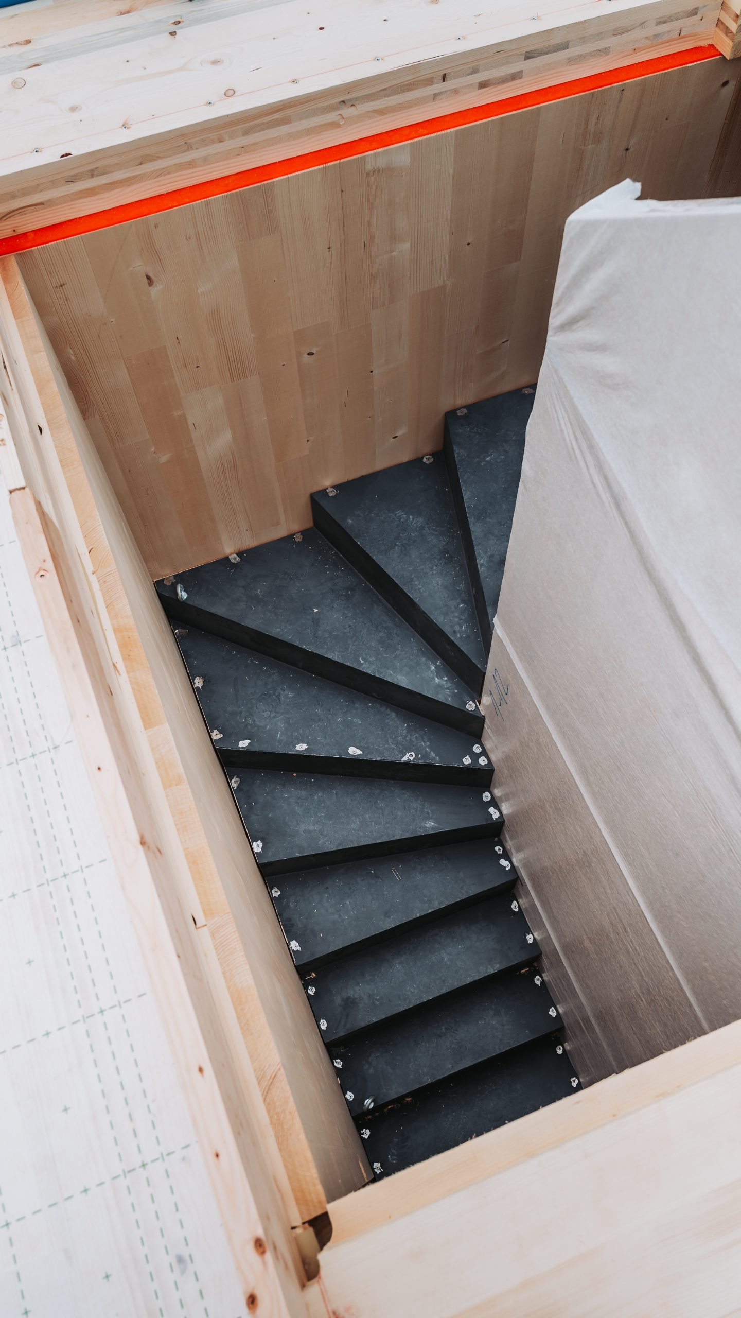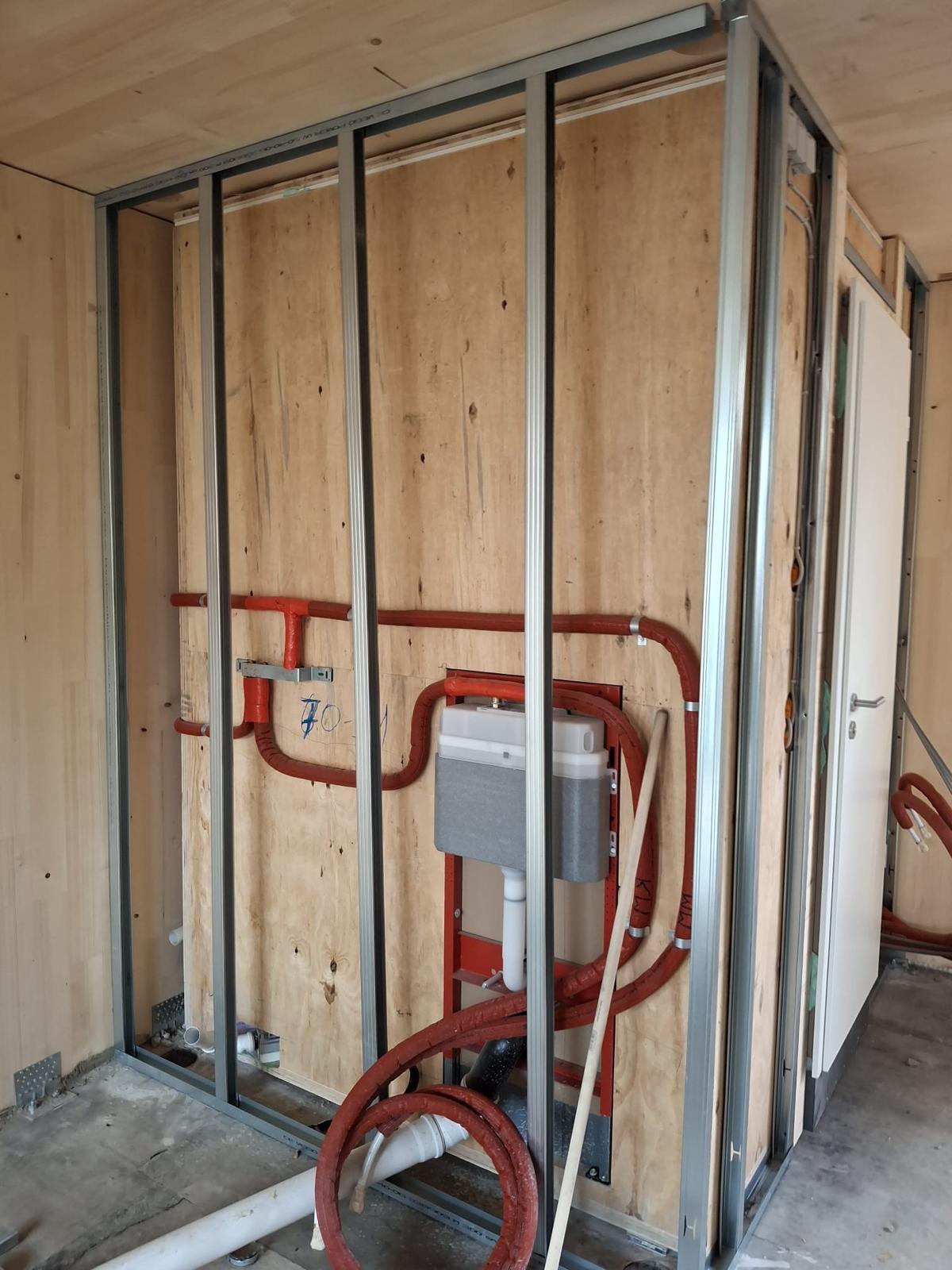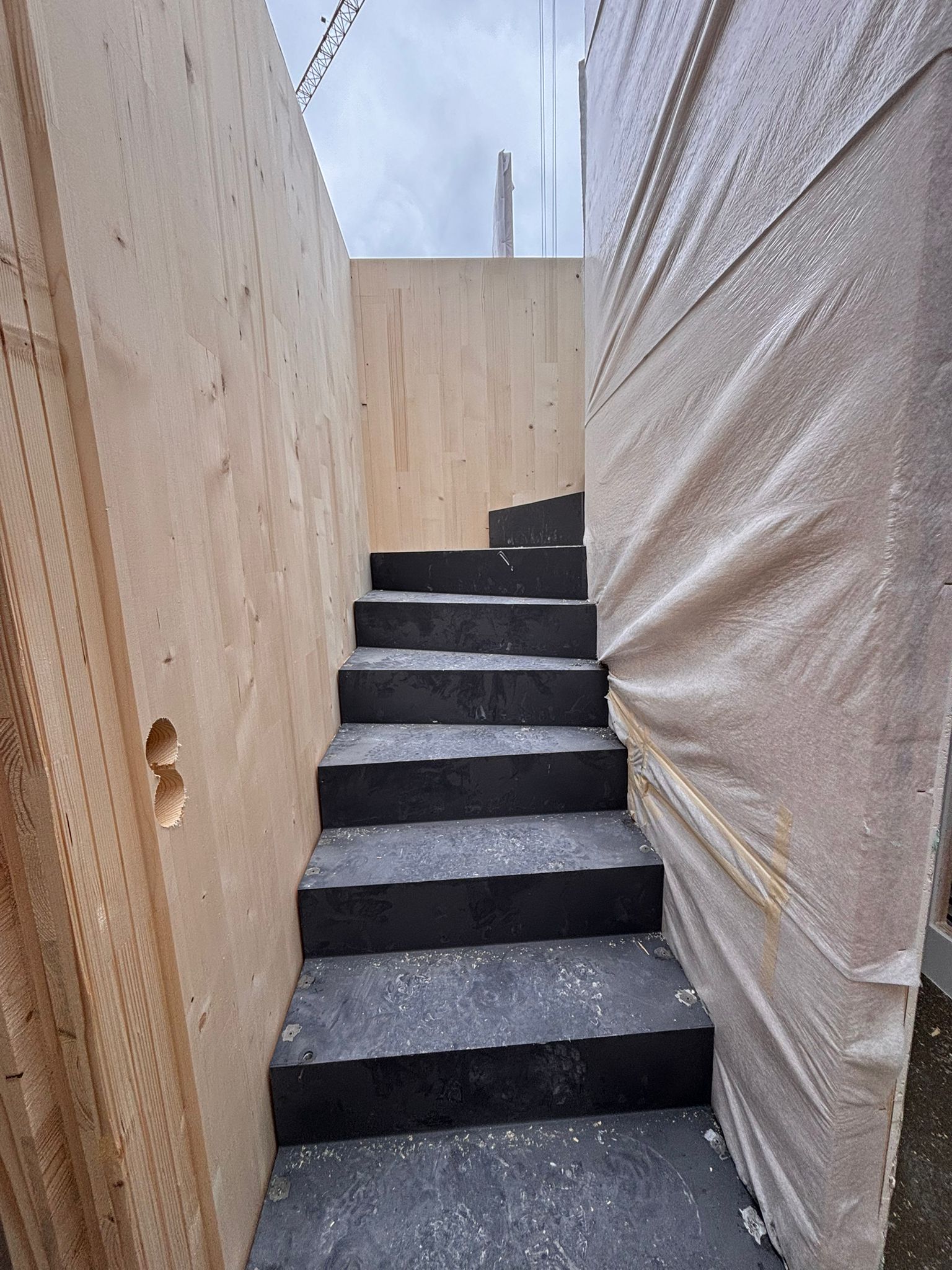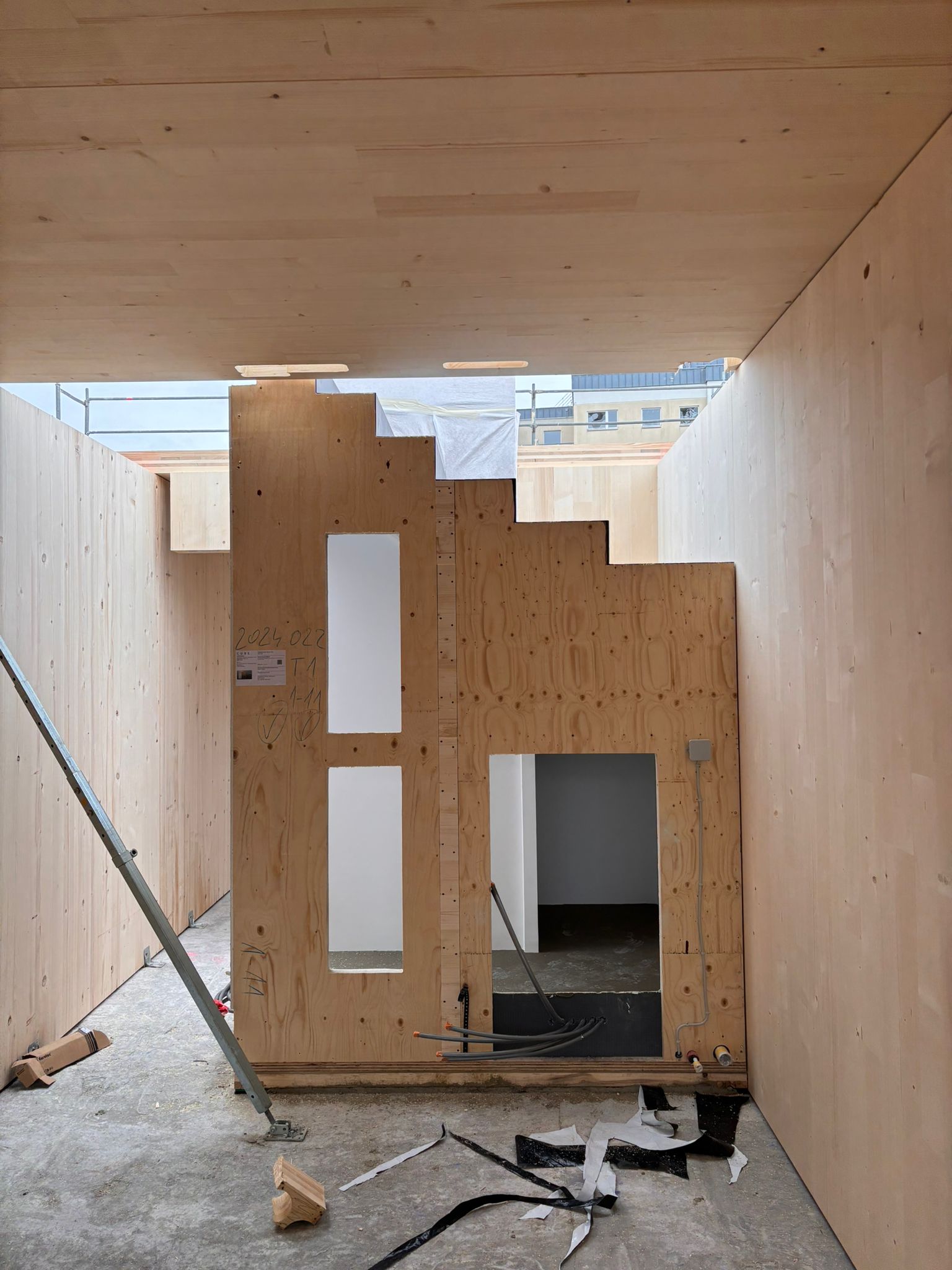 Der Großteil der Innenräume des Gebäudes sind sichtbare CLT-Holzwände. Die Wand ist fertig wenn der Zimmermann sie aufbaut und kann sichtbar bleiben. Dabei wird die Wand bereits im Werk gehobelt und geschliffen und fertig angeliefert. ELT und TGA werden in der Werksplanung und bei der Fertigung im Werk berücksichtigt und in der Wand versteckt.